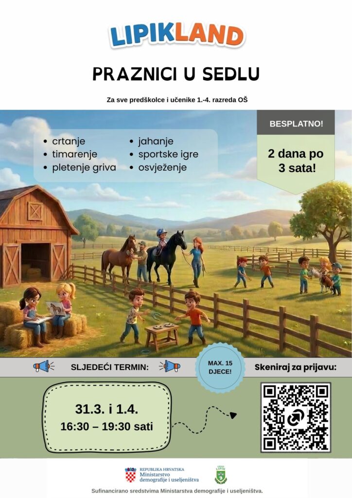 Tražite li idealan način da vaša djeca provedu vikend daleko od ekrana, na svježem zraku i u društvu plemenitih životinja, imamo sjajne vijesti! U sklopu projekta „Lipikland – svijet igre i znanja”, Kasački klub Diamant organizira radionice namijenjene djeci predškolske dobi te učenicima od 1. do 4. razreda osnovne škole. Prepoznajući izazove s kojima se zaposleni roditelji susreću tijekom školskih praznika, Ministarstvo demografije i useljeništva sufinancira ovaj program kako bi se obiteljima olakšalo usklađivanje poslovnog i privatnog života, a djeci osiguralo kvalitetno, sigurno i – što je najvažnije – potpuno besplatno provođenje slobodnog vremena.