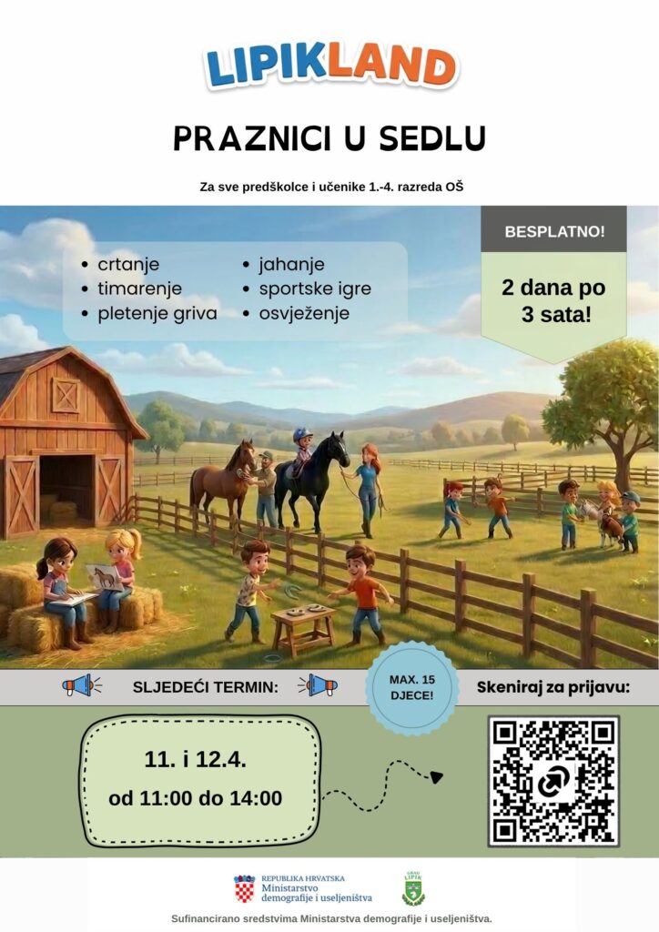 Iako nam je kiša prošlog tjedna malo pomrsila planove, dobra vijest je da nam se ovog vikenda napokon vraća sunce! Zbog loših vremenskih uvjeta, prvi ciklus besplatnih vikend-radionica “Praznici u sedlu” (koje se provode u sklopu projekta Lipikland – svijet igre i znanja) održat će se ove subote i nedjelje, 11. i 12. travnja od 11:00 do 14:00 sati.
